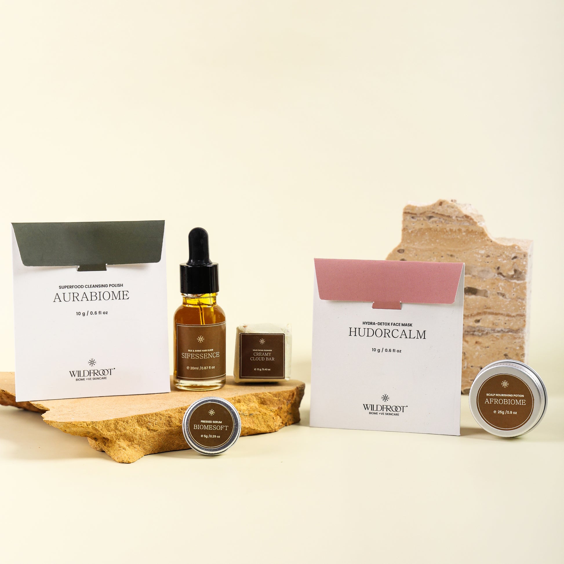Begin your journey with Wildfroot.The Prelude Collection is a curated introduction to our world of biome-care — six artisanal miniatures housed in a sustainable jute drawstring bag. Each product is thoughtfully crafted to restore balance, resilience, and radiance to your skin and hair, making this set the perfect way to experience the essence of Wildfroot.